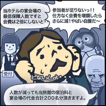 通常は個室や貸切の店舗の場合人数に変更があるとこのような問題が生じます。店舗に支払う金額が足りない為にゲストの会費を千円ずつ上乗せ・・・。会費が高くなると更に出席者が減ってしまう。こんな悪循環になってしまう事も考えられます。