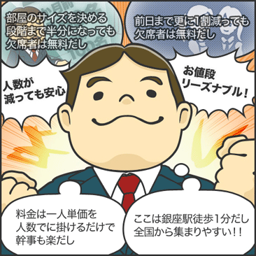 個室のキャンセル料や欠席者の代金等の心配がついてきます